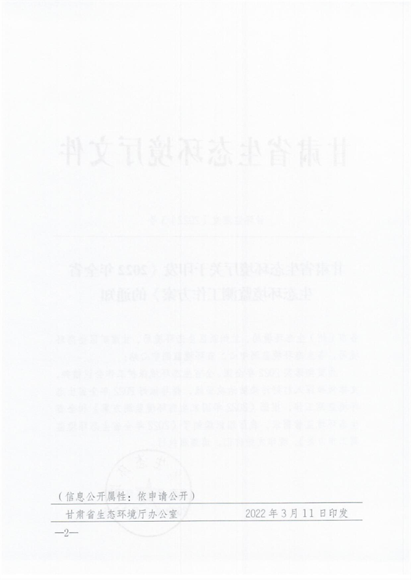 《甘肅省 2022年全省生態(tài)環(huán)境監(jiān)測工作方案》(甘環(huán)監(jiān)測發(fā)【2022】3號)