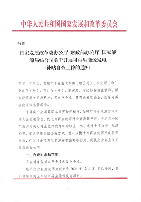 《關(guān)于開展可再生能源發(fā)電補(bǔ)貼自查工作的通知》
