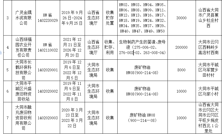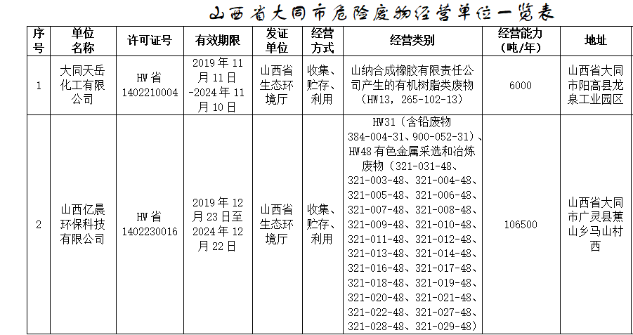《山西省大同市危險廢物經(jīng)營單位一覽表》