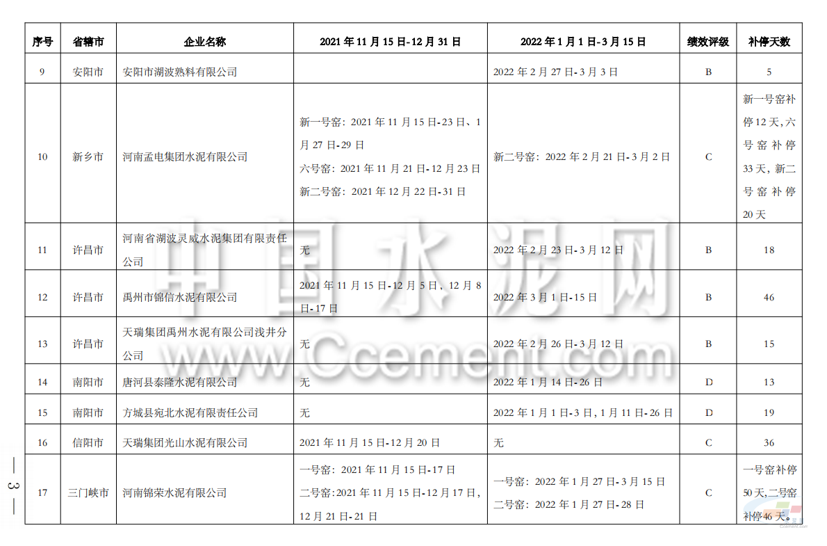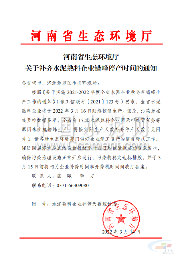 《河南省 關于補齊水泥熟料企業(yè)錯峰停產(chǎn)時間的通知》