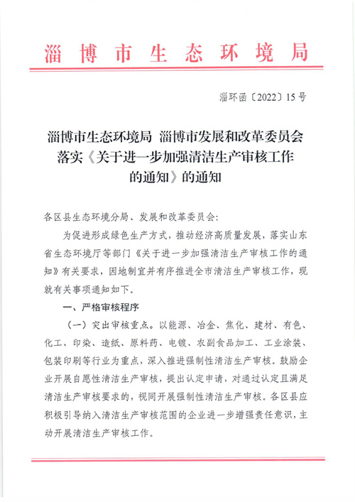 《山東淄博關(guān)于進一步加強清潔生產(chǎn)審核工作的通知》(淄環(huán)函【2022】15號)