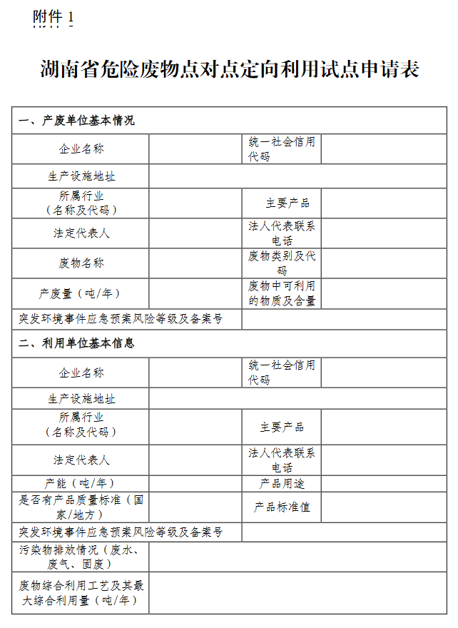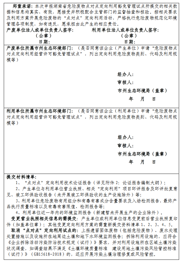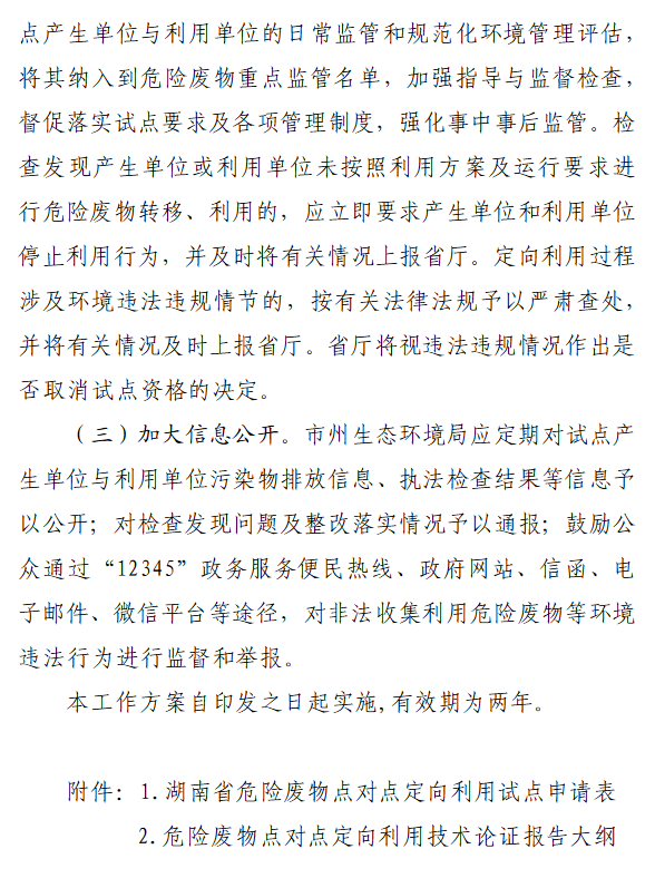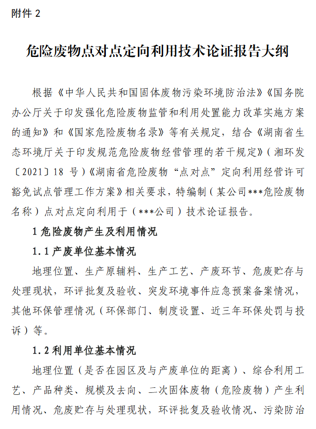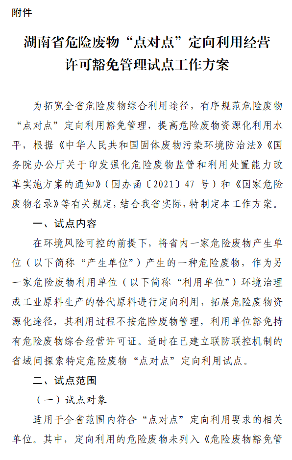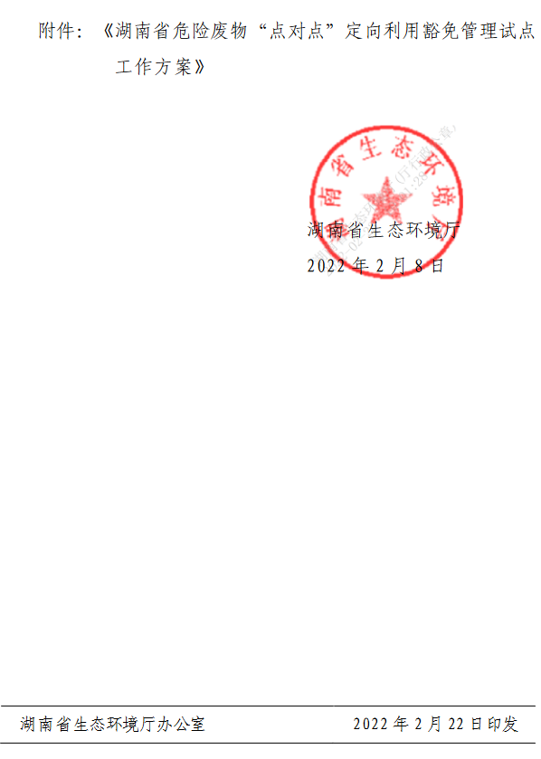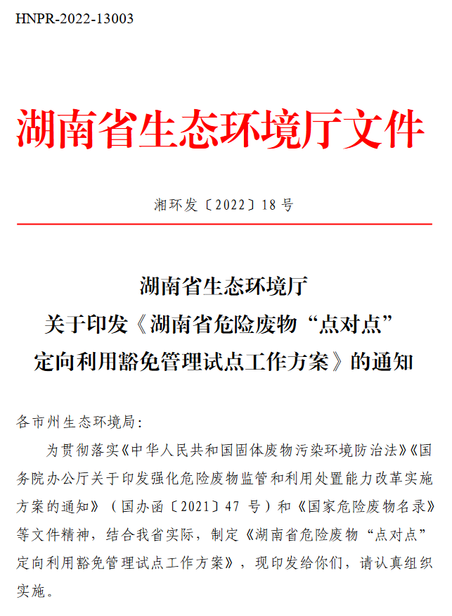 《湖南省危險廢物“點對點”定向利用豁免管理試點工作方案》(湘環(huán)發(fā)【2022】18號)