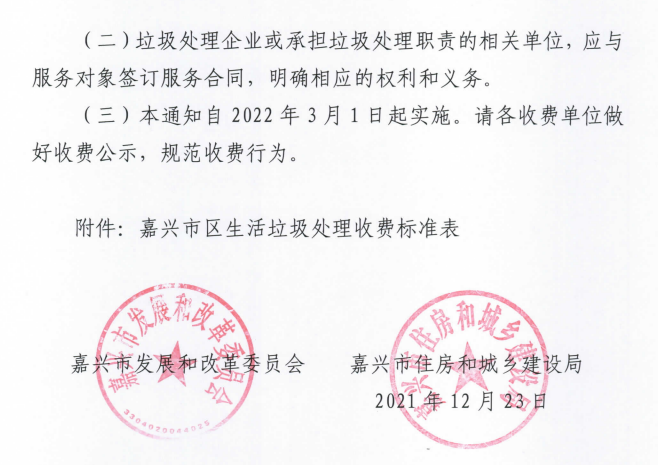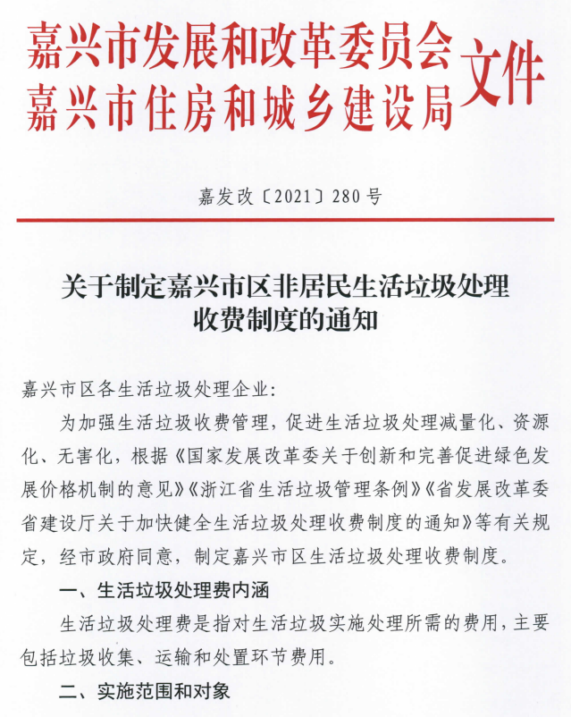 《嘉興市區(qū)非居民生活垃圾處理收費制度》(嘉發(fā)改【2021】280號)