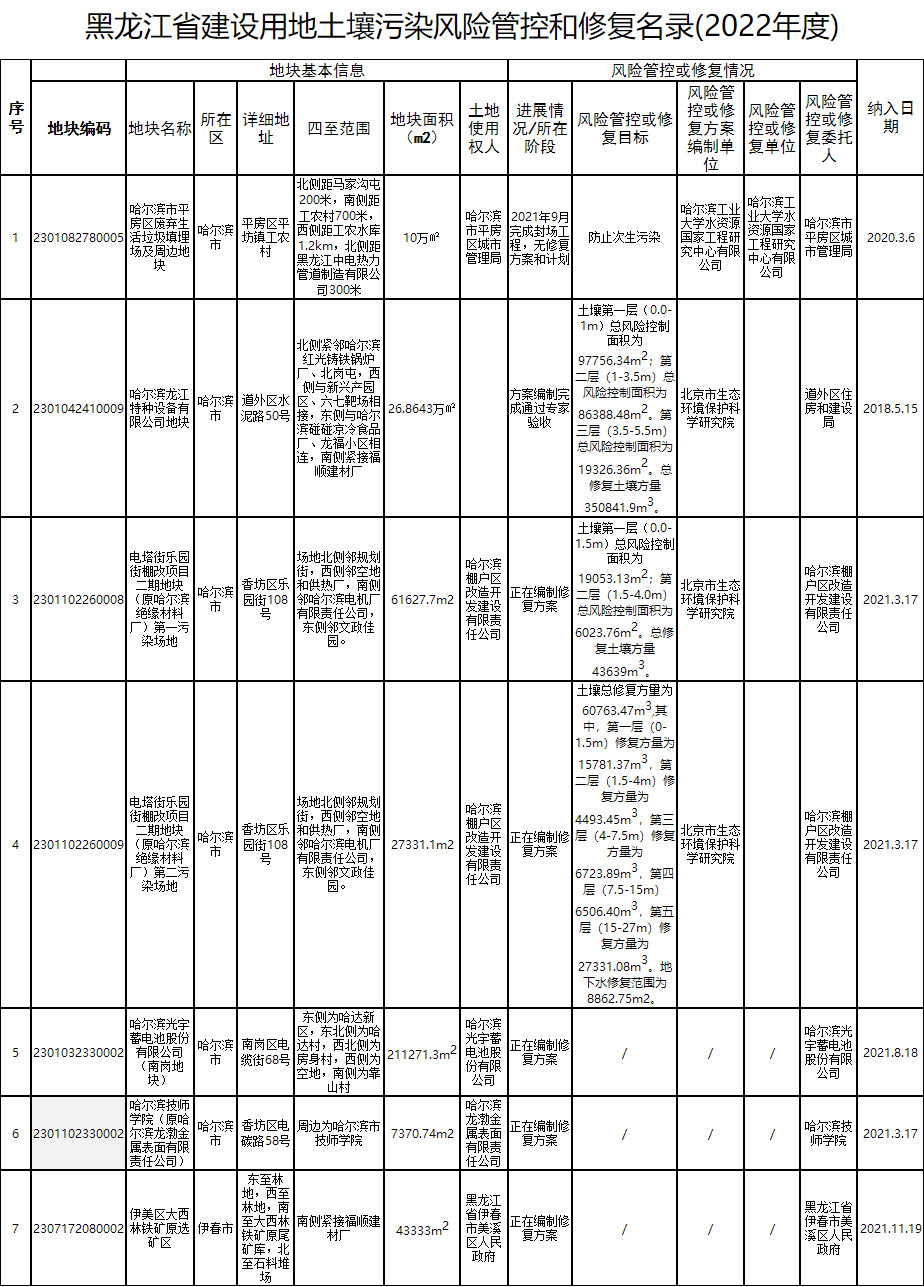 《黑龍江省建設(shè)用地土壤污染風(fēng)險(xiǎn)管控和修復(fù)名錄》(2022年度)