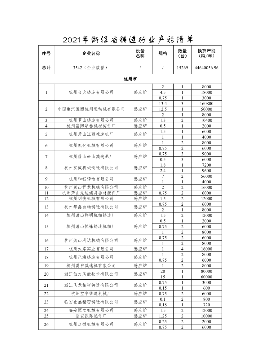 浙江省經(jīng)濟和信息化廳關于2021年浙江省鑄造產(chǎn)能清單的通告