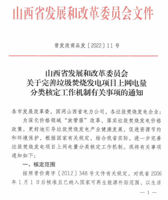 《山西省 關(guān)于完善垃圾焚燒發(fā)電項目上網(wǎng)電量分類核定工作機(jī)制有關(guān)事項的通知》(晉發(fā)改商品發(fā)【2022】11號)