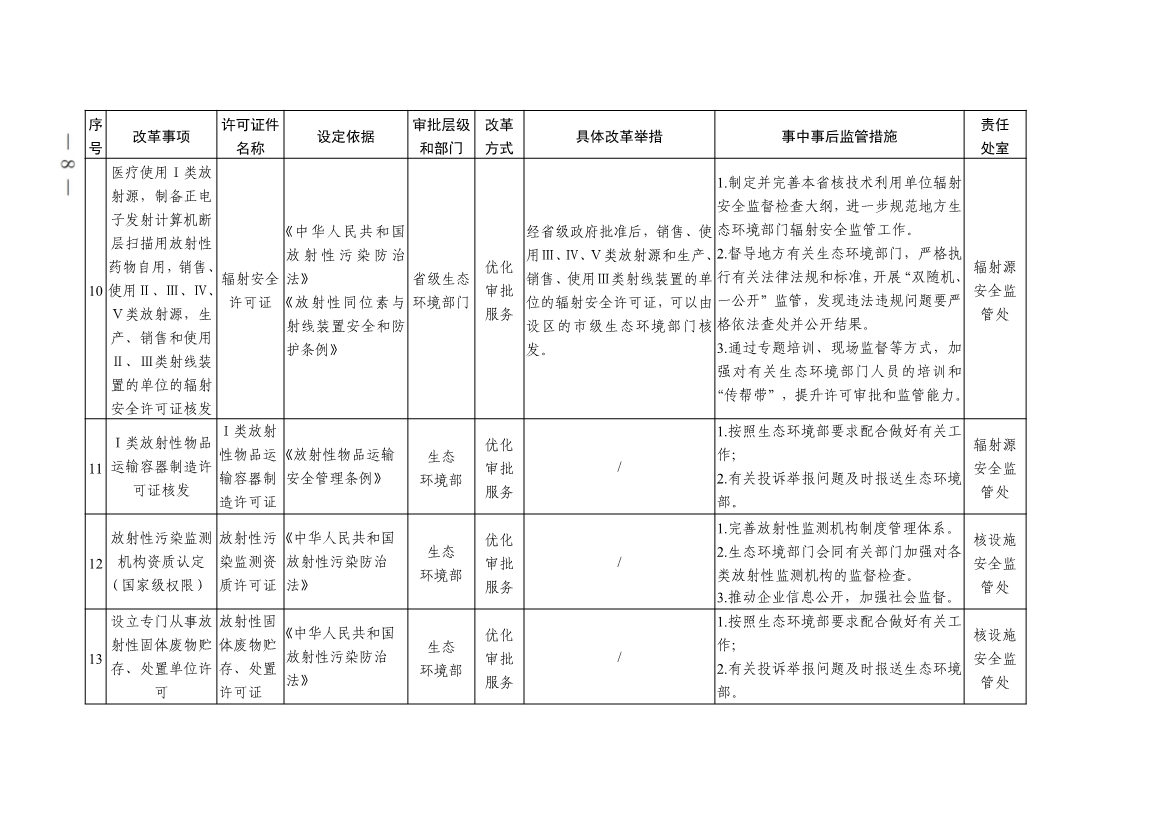 (一)直接取消審批。在全省范圍內(nèi)對“放射性污染監(jiān)測機構(gòu)資質(zhì)認定(省級權(quán)限)”直接取消審批。取消審批后,取得相應(yīng)計量認證資質(zhì)的檢驗檢測機構(gòu)即可從事核技術(shù)利用建設(shè)項目輻射監(jiān)測工作,無需重復(fù)取得生態(tài)環(huán)境廳的批準,行政機關(guān)、企事業(yè)單位、行業(yè)組織亦不得要求企業(yè)提供相關(guān)認定和批準文件。(二)優(yōu)化審批服務(wù)。將“生產(chǎn)放射性同位素(除醫(yī)療自用的短半衰期放射性藥物外)許可證核發(fā)”涉企經(jīng)營許可中場所等級屬于乙級、丙級的生產(chǎn)放射性同位素單位的審批權(quán)限由生態(tài)環(huán)境部承接至省廳?!搬t(yī)療使用I類放射源,制備正電子發(fā)射計算機斷層掃描用放射性藥物自用,銷售、使用II、III、IV、V類放射源,生產(chǎn)、銷售和使用II、III類射線裝置的單位的輻射安全許可證核發(fā)”涉企經(jīng)營許可中銷售、使用III、IV、V類放射源和生產(chǎn)、銷售、使用III類射線裝置的單位的輻射安全許可證,經(jīng)省級政府批準后,下放至設(shè)區(qū)的市級生態(tài)環(huán)境部門核發(fā)。對“排污許可”“危險廢物綜合經(jīng)營許可證核發(fā)”“廢棄電器電子產(chǎn)品處理企業(yè)資格審批”涉企經(jīng)營事項,精簡申請材料,加強信息共享,提高審批效率。《四川省生態(tài)環(huán)境領(lǐng)域深化“證照分離”改革進一步激發(fā)市場主體發(fā)展活力實施方案》
