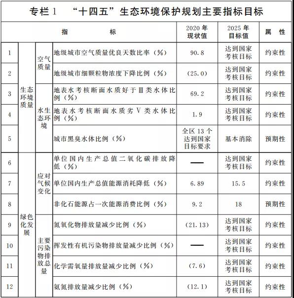 2025年的主要目標(biāo)從發(fā)展更低碳、空氣更清新、水體更清潔、土壤更安全、生態(tài)更宜居5個(gè)維度,共設(shè)置了16項(xiàng)規(guī)劃目標(biāo)指標(biāo),包括PM2.5年均濃度下降到35微克/立方米左右、基本消除重污染天氣,消除劣V類(lèi)水體,生態(tài)環(huán)境質(zhì)量指數(shù)穩(wěn)步提升,以及碳排放強(qiáng)度、優(yōu)良天數(shù)比率、地表水國(guó)控?cái)嗝孢_(dá)到或好于Ⅲ類(lèi)比例等。