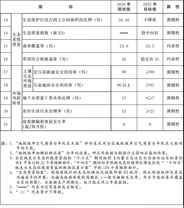 《內(nèi)蒙古自治區(qū)“十四五”生態(tài)環(huán)境保護(hù)規(guī)劃》共12章、55節(jié)。為確保自治區(qū)生態(tài)環(huán)境保護(hù)工作可量化、能執(zhí)行,《規(guī)劃》確定了“十四五”生態(tài)環(huán)境質(zhì)量、綠色化發(fā)展、生態(tài)系統(tǒng)質(zhì)量和環(huán)境風(fēng)險(xiǎn)防范四大類(lèi)21項(xiàng)具體指標(biāo),其中約束性指標(biāo)12項(xiàng),預(yù)期性指標(biāo)9項(xiàng)。