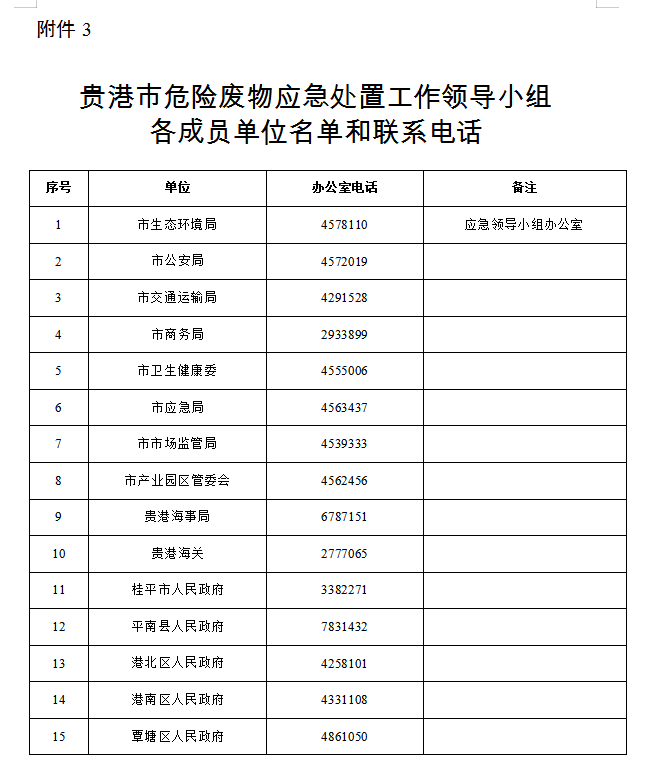 3.貴港市危險廢物應(yīng)急處置工作領(lǐng)導(dǎo)小組各成員單位名單和聯(lián)系電話