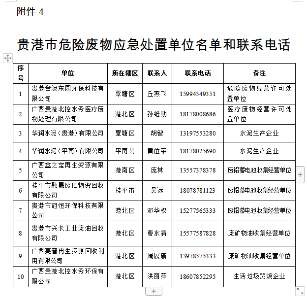 4.貴港市危險廢物應(yīng)急處置單位名單和聯(lián)系電話