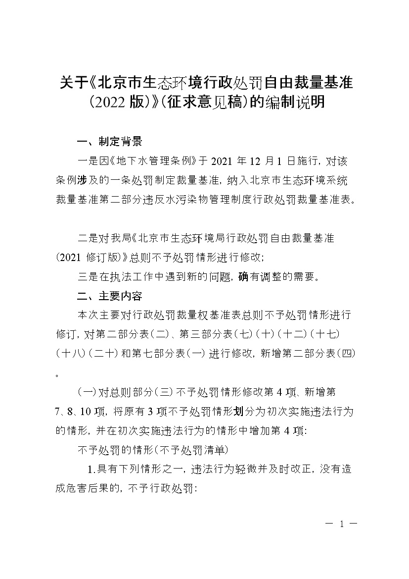 因《地下水管理條例》于2021年12月1日施行,并根據(jù)執(zhí)法需求,對《北京市生態(tài)環(huán)境系統(tǒng)自由裁量基準(2021修訂版)》進行修訂。為此,我局草擬了《北京市生態(tài)環(huán)境行政處罰裁量基準(2022版)》(征求意見稿)(附件1)及其編制說明(附件2),草案起草工作已經(jīng)完成。