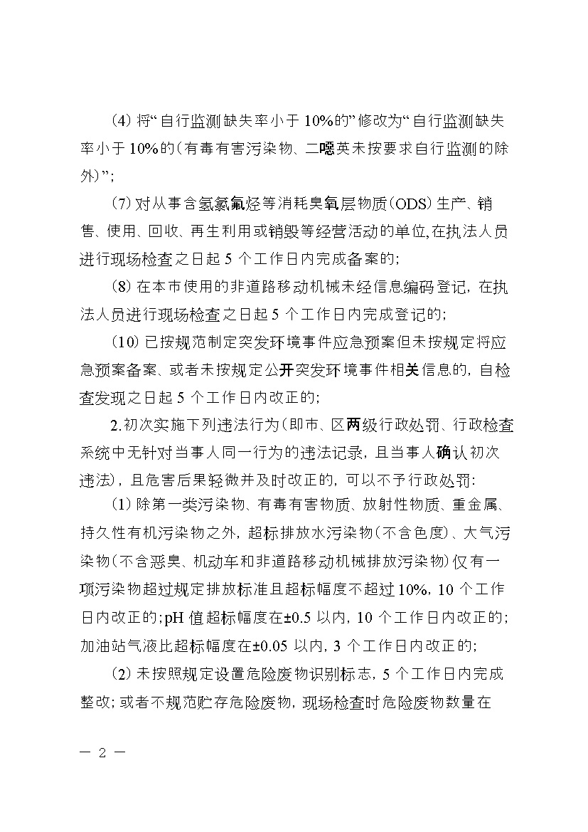 2.初次實施下列違法行為(即市、區(qū)兩級行政處罰、行政檢查系統(tǒng)中無針對當事人同一行為的違法記錄,且當事人確認初次違法),且危害后果輕微并及時改正的,可以不予行政處罰: