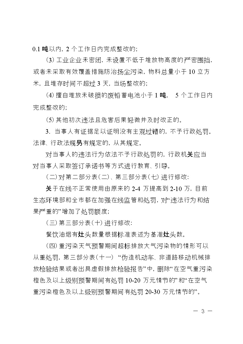(1)除第一類污染物、有毒有害物質(zhì)、放射性物質(zhì)、重金屬、持久性有機污染物之外,超標排放水污染物(不含色度)、大氣污染物(不含惡臭、機動車和非道路移動機械排放污染物)僅有一項污染物超過規(guī)定排放標準且超標幅度不超過10%,10個工作日內(nèi)改正的;pH值超標幅度在±0.5以內(nèi),10個工作日內(nèi)改正的;加油站氣液比超標幅度在±0.05以內(nèi),3個工作日內(nèi)改正的;