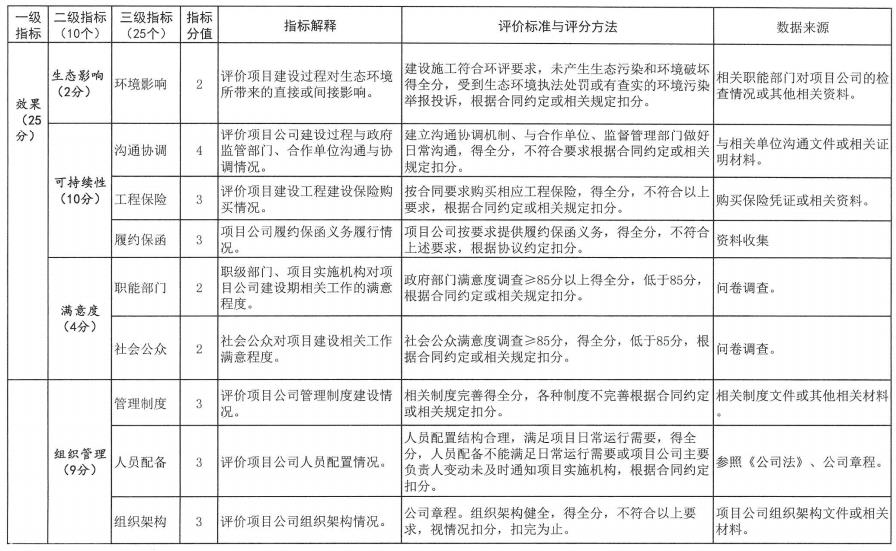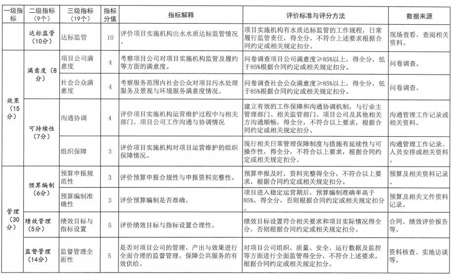按照《財政部政府和社會資本合作(PPP)項目績效管理操作指引》(以下簡稱《操作指引》)(財金〔2020〕13號)要求,在安徽省財政廳的指導下,12月16日,合肥市在全省率先出臺《城鎮(zhèn)污水行業(yè)PPP項目績效指標體系》,為全市城鎮(zhèn)污水類PPP項目績效考核提供指導和參照。 績效指標體系設(shè)置按照“全面、規(guī)范、合理、科學”的原則。一是全面收集城鎮(zhèn)污水處理行業(yè)標準和相關(guān)政策、項目實施方案、建設(shè)運營等資料,分析掌握行業(yè)建設(shè)運營管理關(guān)鍵節(jié)點;二是按照《操作指引》和相關(guān)政策要求,明確產(chǎn)出、效果、管理的指標總體架構(gòu),規(guī)范設(shè)置一、二、三級績效指標;三是開展項目實地調(diào)研和現(xiàn)場察看,深入廠區(qū)和車間參觀生產(chǎn)過程,了解城鎮(zhèn)污水類PPP項目產(chǎn)出內(nèi)容,總結(jié)已開展項目績效評價工作經(jīng)驗,確保指標合理可行;四是組織社會資本方業(yè)務(wù)骨干、PPP和績效領(lǐng)域?qū)<?、市直相關(guān)部門,對指標設(shè)置、指標內(nèi)容、指標分值等進行逐項評審,分析采納專家們從項目運營、安全保障、竣工驗收等方面提出的意見和建議,確保指標體系科學、客觀和公正。 《合肥市城鎮(zhèn)污水行業(yè)PPP項目績效指標體系》出臺,是對分行業(yè)績效指標體系的積極探索,可以更具體和針對性地指導城鎮(zhèn)污水行業(yè)合作各方績效評價工作,助推項目提質(zhì)增效,提高污水處理的效率和生產(chǎn)服務(wù)的標準化。 截至目前,全市城鎮(zhèn)污水行業(yè)PPP項目共8個,項目投資額 44.37億元。