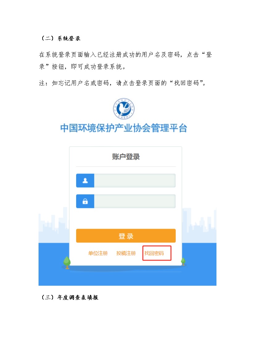 (二)網(wǎng)站填報(bào)。登錄中國(guó)環(huán)境保護(hù)產(chǎn)業(yè)協(xié)會(huì)企業(yè)數(shù)據(jù)調(diào)查平臺(tái)(.cn/login_wwsb.jsp),注冊(cè)并填報(bào)信息,詳細(xì)步驟請(qǐng)參照填報(bào)指南(附件2)。資料庫_模版下載_報(bào)告模板