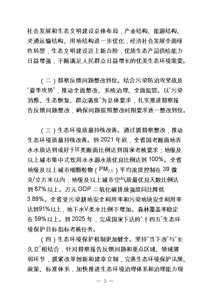 《整改方案》明確了四個(gè)方面整改工作目標(biāo):一是綠色發(fā)展理念進(jìn)一步深化。生態(tài)優(yōu)先、綠色發(fā)展理念進(jìn)一步增強(qiáng),碳達(dá)峰碳中和納入經(jīng)濟(jì)社會(huì)發(fā)展和生態(tài)文明建設(shè)總體布局,產(chǎn)業(yè)結(jié)構(gòu)、能源結(jié)構(gòu)、交通運(yùn)輸結(jié)構(gòu)、用地結(jié)構(gòu)進(jìn)一步優(yōu)化。二是督察反饋問(wèn)題整改到位。扎實(shí)推進(jìn)督察報(bào)告反饋問(wèn)題整改,確保問(wèn)題按照整改時(shí)限要求逐一整改到位。三是生態(tài)環(huán)境質(zhì)量持續(xù)改善。到2021年底,國(guó)考斷面地表水水質(zhì)達(dá)到國(guó)家考核要求,地級(jí)及以上城市細(xì)顆粒物(PM2.5)平均濃度控制在39微克/立方米以內(nèi),受污染地塊安全利用率達(dá)到91%以上。四是生態(tài)環(huán)境保護(hù)機(jī)制更加健全。抓緊改革創(chuàng)新和建章立制,完善生態(tài)環(huán)境保護(hù)法規(guī)、政策、標(biāo)準(zhǔn)體系,加快推進(jìn)生態(tài)環(huán)境治理體系和治理能力現(xiàn)代化。