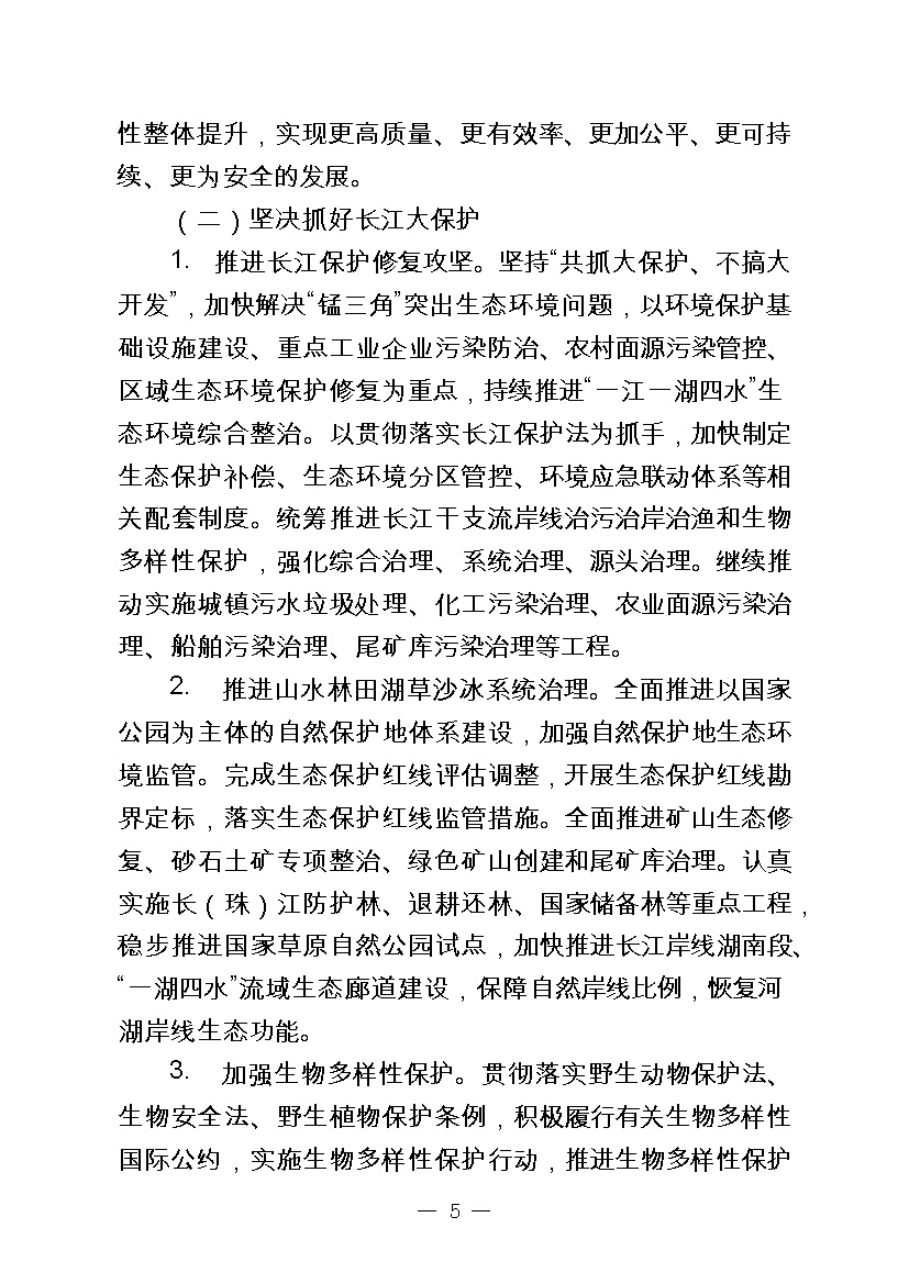 二是堅(jiān)決抓好長(zhǎng)江大保護(hù)。堅(jiān)持“共抓大保護(hù)、不搞大開(kāi)發(fā)”,加快解決“錳三角”突出生態(tài)環(huán)境問(wèn)題,持續(xù)推進(jìn)“一江一湖四水”生態(tài)環(huán)境綜合整治。統(tǒng)籌推進(jìn)長(zhǎng)江干支流岸線治污治岸治漁和生物多樣性保護(hù)。推進(jìn)山水林田湖草沙冰系統(tǒng)治理,全面推進(jìn)以國(guó)家公園為主體的自然保護(hù)地體系建設(shè),加強(qiáng)自然保護(hù)地生態(tài)環(huán)境監(jiān)管。實(shí)施生物多樣性保護(hù)行動(dòng),推進(jìn)生物多樣性保護(hù)重大工程。鞏固地級(jí)城市建成區(qū)黑臭水體治理成效,加快推進(jìn)鄉(xiāng)鎮(zhèn)污水處理設(shè)施建設(shè),規(guī)范已建設(shè)施運(yùn)行。摸清全省污水收集管網(wǎng)建設(shè)底數(shù),強(qiáng)化污水收集配套管網(wǎng)建設(shè)。建立健全垃圾分類體系。