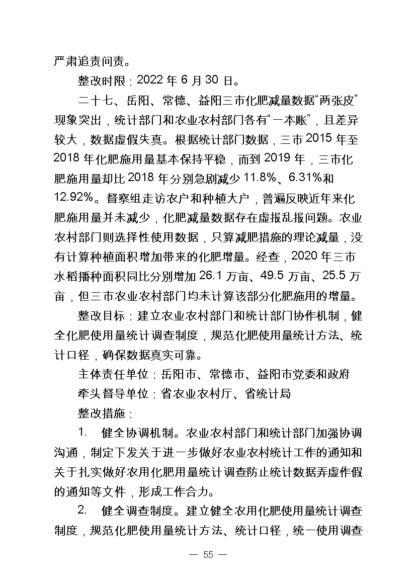 一是強(qiáng)化組織領(lǐng)導(dǎo)。各市州和省直有關(guān)部門進(jìn)一步健全整改工作組織領(lǐng)導(dǎo)體系,建立高效工作機(jī)制。各整改責(zé)任單位制定具體整改方案,報(bào)省突出環(huán)境問(wèn)題整改工作領(lǐng)導(dǎo)小組辦公室備案,作為督導(dǎo)調(diào)度和整改銷號(hào)依據(jù)。