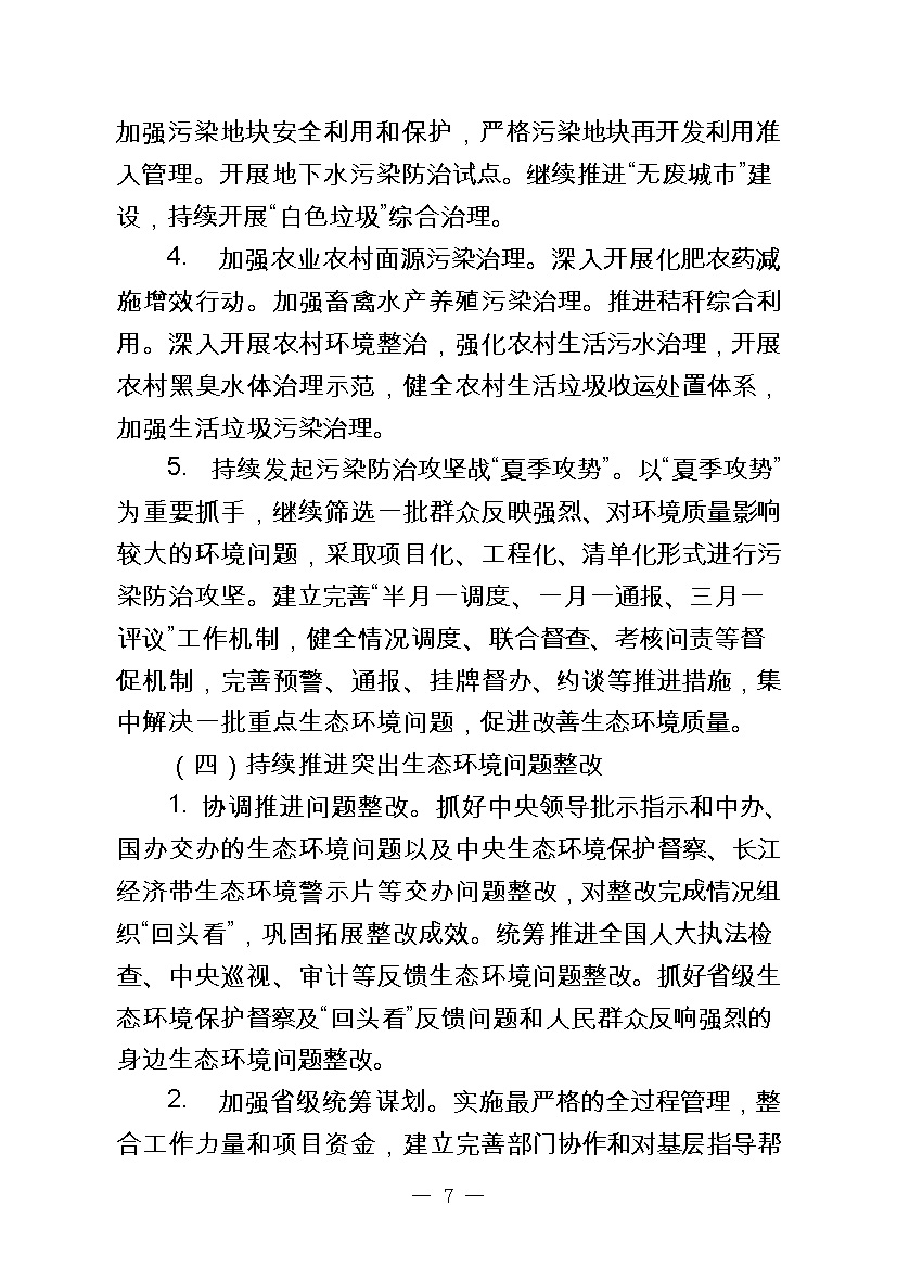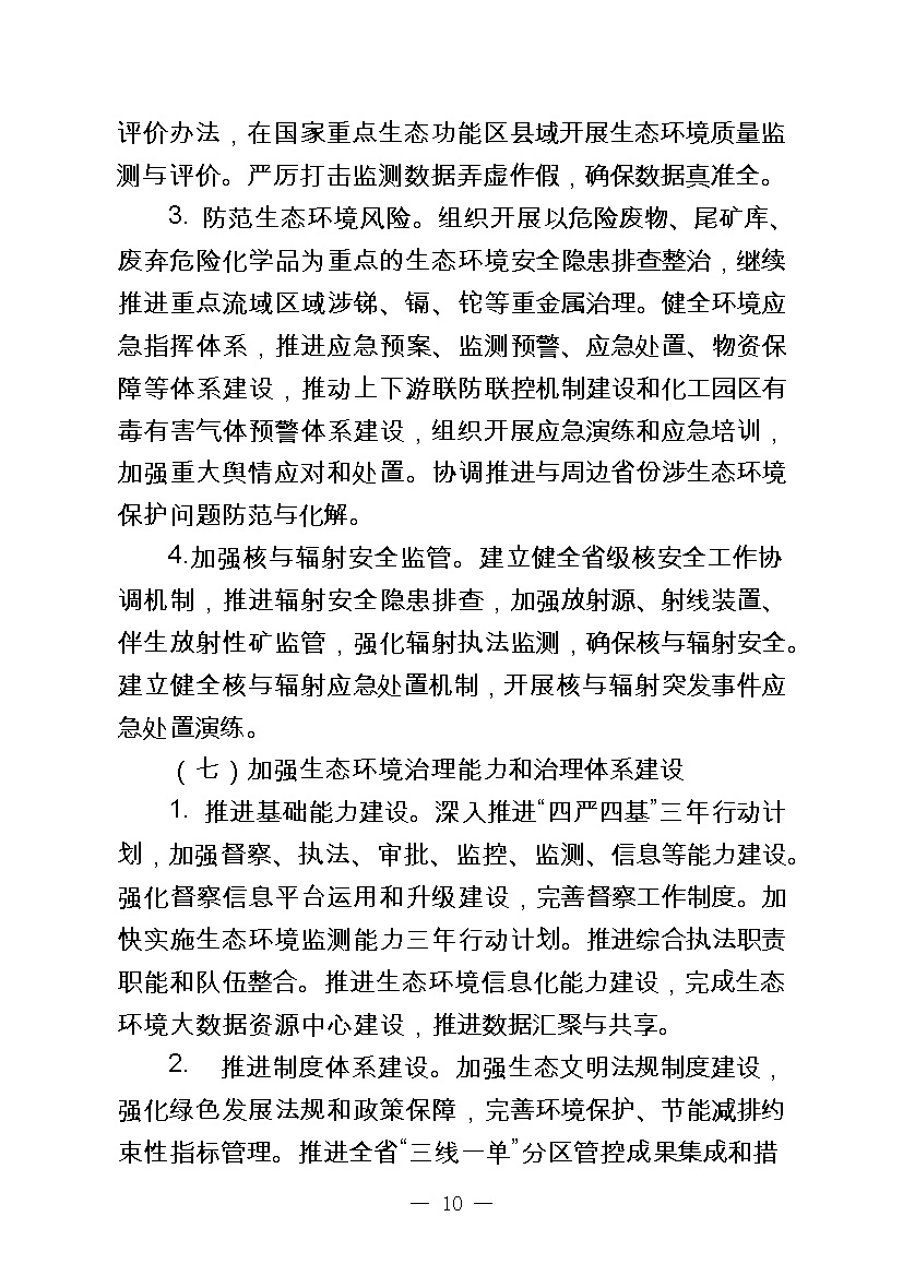 七是加強(qiáng)生態(tài)環(huán)境治理能力和治理體系建設(shè)。深入推進(jìn)“四嚴(yán)四基”三年行動(dòng)計(jì)劃。強(qiáng)化督察信息平臺(tái)運(yùn)用和升級(jí)建設(shè)。加快實(shí)施生態(tài)環(huán)境監(jiān)測(cè)能力三年行動(dòng)計(jì)劃。推進(jìn)綜合執(zhí)法職責(zé)職能和隊(duì)伍整合。推進(jìn)生態(tài)環(huán)境信息化能力建設(shè)。加強(qiáng)生態(tài)文明法規(guī)制度建設(shè),完善環(huán)境保護(hù)、節(jié)能減排約束性指標(biāo)管理。深化生態(tài)環(huán)境垂直管理制度改革,建立健全省級(jí)生態(tài)環(huán)境保護(hù)督政體系,做好垂直管理制度改革“后半篇”文章。完善排污許可證、生態(tài)補(bǔ)償、生態(tài)環(huán)境損害賠償?shù)戎贫龋罨盼蹤?quán)制度改革,完善環(huán)境污染強(qiáng)制責(zé)任保險(xiǎn)制度。扶持壯大環(huán)保產(chǎn)業(yè),支持服務(wù)企業(yè)綠色發(fā)展。健全環(huán)保信用評(píng)價(jià)體系,推進(jìn)園區(qū)環(huán)境污染第三方治理。