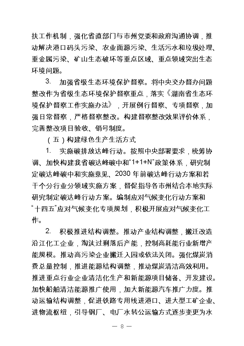 五是構(gòu)建綠色生產(chǎn)生活方式。實(shí)施碳排放達(dá)峰行動(dòng),按照中央部署要求,統(tǒng)籌協(xié)調(diào)、加快構(gòu)建碳達(dá)峰碳中和“1+1+N”政策體系,研究制定碳達(dá)峰碳中和實(shí)施意見(jiàn)、2030年前碳達(dá)峰行動(dòng)方案和若干個(gè)分行業(yè)分領(lǐng)域?qū)嵤┓桨福酱僦笇?dǎo)各市州結(jié)合本地區(qū)實(shí)際研究制定碳達(dá)峰行動(dòng)方案。編制應(yīng)對(duì)氣候變化行動(dòng)方案和“十四五”應(yīng)對(duì)氣候變化專項(xiàng)規(guī)劃,積極開(kāi)展應(yīng)對(duì)氣候變化工作。推動(dòng)產(chǎn)業(yè)結(jié)構(gòu)調(diào)整,搬遷改造沿江化工企業(yè),淘汰過(guò)剩落后產(chǎn)能,控制高耗能行業(yè)新增產(chǎn)能規(guī)模。推動(dòng)高污染企業(yè)搬遷入園或依法關(guān)閉。強(qiáng)化煤炭消費(fèi)總量控制,推進(jìn)能源結(jié)構(gòu)調(diào)整。推進(jìn)綠色生活和綠色消費(fèi)方式,推動(dòng)落實(shí)價(jià)格、財(cái)稅、金融等政策。加大環(huán)保設(shè)施向公眾開(kāi)放力度。完善生態(tài)環(huán)境公益訴訟制度。推進(jìn)生態(tài)文明示范創(chuàng)建。
