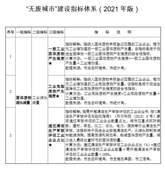 為指導(dǎo)城市做好“無廢城市”建設(shè)工作,推動城市大幅度減少固體廢物產(chǎn)生量,促進固體廢物綜合利用,降低固體廢物危害性,最大限度降低固體廢物填埋量,穩(wěn)步提升固體廢物治理體系和治理能力,制定《“無廢城市”建設(shè)指標體系(2021 年版)》[以下簡稱《指標體系(2021 年版)》]。