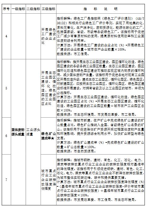 一級指標主要包括固體廢物源頭減量、資源化利用、最終處置、保障能力、群眾獲得感等 5 個方面。二級指標主要覆蓋工業(yè)、農(nóng)業(yè)、建筑業(yè)、生活領(lǐng)域固體廢物的減量化、資源化、無害化,以及制度、技術(shù)、市場、監(jiān)管體系建設(shè)與群眾獲得感等 17 個方面。三級指標是對一級指標和二級指標的具體細化和量化,劃分為兩類:第 I 類為必選指標(標注★),共 25 項,是各地開展“無廢城市”建設(shè)均需落實的約束性指標。第 II 類為可選指標,共 33 項,是各地依據(jù)城市類型、特點及任務(wù)安排進行選擇的指標。各項指標數(shù)據(jù)主要來源于現(xiàn)有統(tǒng)計調(diào)查數(shù)據(jù)和專項調(diào)查數(shù)據(jù)。此外,各地可結(jié)合自身發(fā)展定位、發(fā)展階段、資源稟賦、產(chǎn)業(yè)結(jié)構(gòu)、經(jīng)濟技術(shù)基礎(chǔ)等差異性,聚焦減污降碳協(xié)同增效,自行設(shè)置自選指標。
