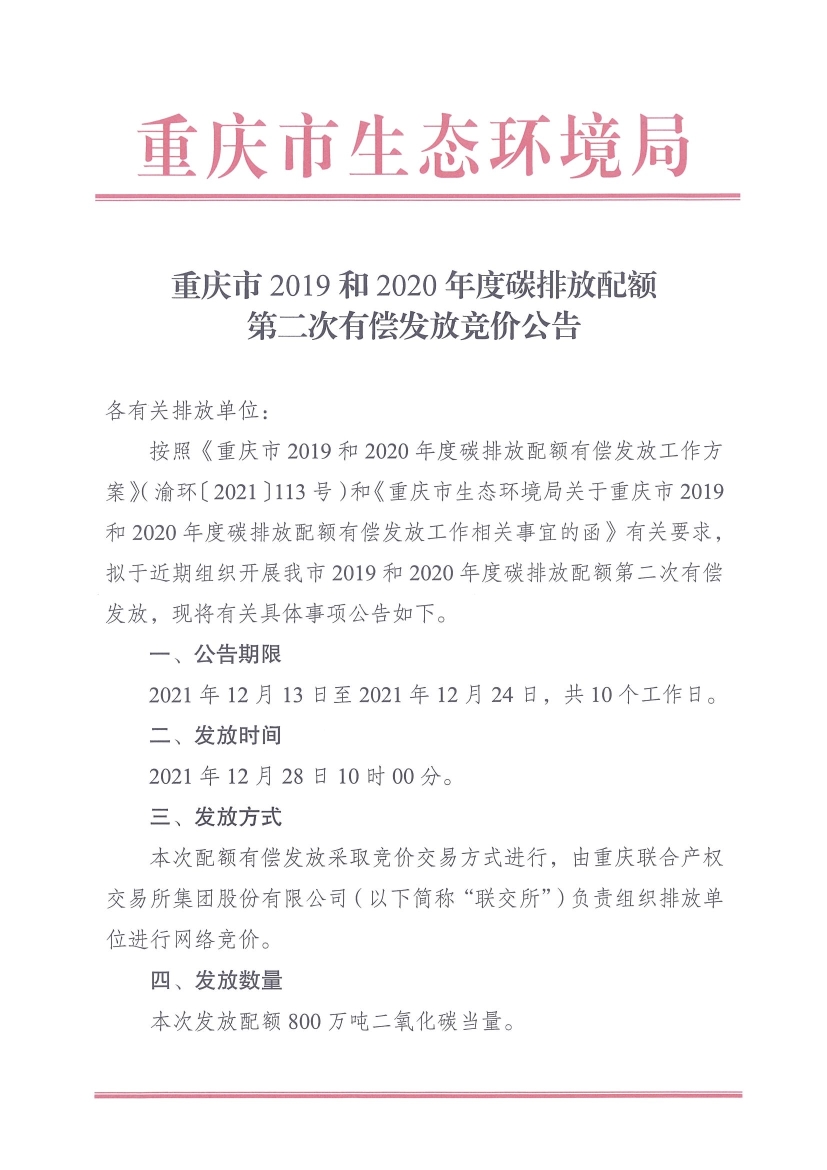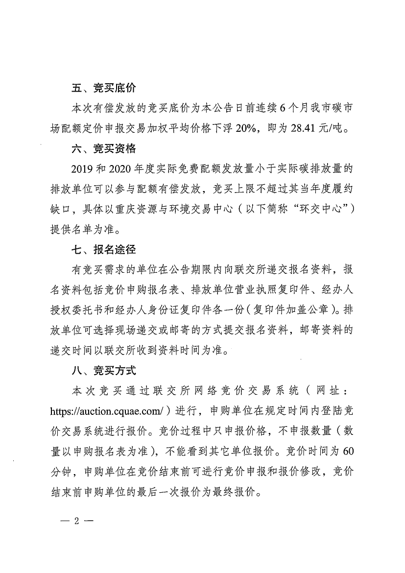 《重慶市2019和2020年度碳排放配額第二次有償發(fā)放競價(jià)公告》