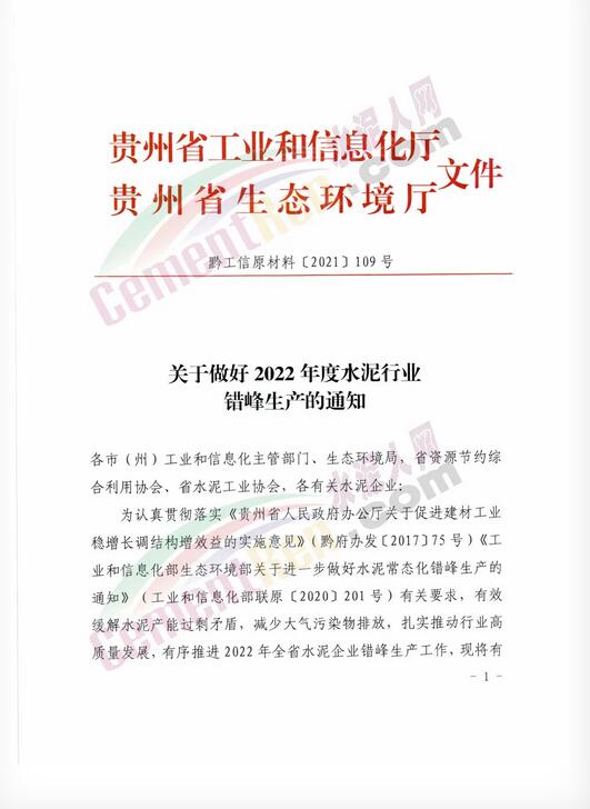 《貴州省關于做好2022年度水泥行業(yè)錯峰生產(chǎn)的通知》(黔工信原材料【2021】109號)