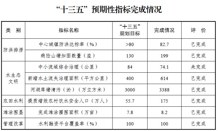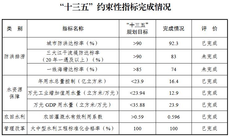 “十三五”期間,全市完成水利投資 479 億元。16 項(xiàng)主要指標(biāo)中,13 項(xiàng)指標(biāo)已完成,2 項(xiàng)約束性指標(biāo)和 1 項(xiàng)預(yù)期性指標(biāo)未完成。由于國(guó)家對(duì)永久基本農(nóng)田和用海政策調(diào)控,部分干堤加固、圍墾工程和海塘提升工程建設(shè)滯后,“三大江干流堤防達(dá)標(biāo)率”、“一線海塘達(dá)標(biāo)率”和“中小流域綜合治理”三個(gè)指標(biāo)難以完成。各指標(biāo)完成情況見(jiàn)下表。