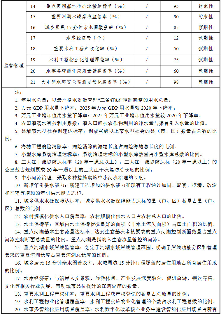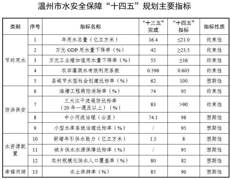——飲水安全先進(jìn)市。進(jìn)一步加快水資源保障體系建設(shè),逐步形成跨區(qū)域多源互濟(jì)的水資源保障新格局,實(shí)現(xiàn)珊溪-趙山渡、澤雅水庫(kù)和甌江引水工程水源大統(tǒng)籌,構(gòu)成大供水網(wǎng)。到“十四五”末,新增年引供水能力 8 億立方米,水資源保障能力位居全省前列。城市應(yīng)急備用供水能力進(jìn)一步提高,實(shí)現(xiàn)“一源一備”。水資源剛性約束制度基本建立,節(jié)水型生產(chǎn)生活方式初步形成,打造豐水地區(qū)節(jié)水標(biāo)桿城市。到“十四五”末,全市用水總量控制在 21.0 億立方米以內(nèi),萬(wàn)元國(guó)內(nèi)生產(chǎn)總值用水量較 2020 年下降 23.5%,萬(wàn)元工業(yè)增加值用水量較 2020 年下降 16%??h級(jí)行政區(qū)節(jié)水型社會(huì)全面建成??h級(jí)及以上集中式飲用水水源地水質(zhì)達(dá)到或優(yōu)于III類水比例為 100%,農(nóng)村供水水源穩(wěn)定,大中型灌區(qū)灌溉供水保證率全面達(dá)標(biāo)。
