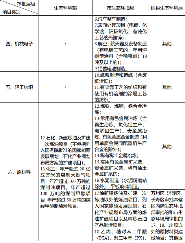 三、北碚區(qū)管轄區(qū)域及兩江新區(qū)、重慶高新區(qū)直接管理區(qū)域內(nèi),除生態(tài)環(huán)境部負責審批和委托市生態(tài)環(huán)境局審批的建設(shè)項目外,其余建設(shè)項目環(huán)評文件由北碚區(qū)生態(tài)環(huán)境局、重慶高新區(qū)生態(tài)環(huán)境局、市生態(tài)環(huán)境局兩江新區(qū)分局按屬地管理原則審批。