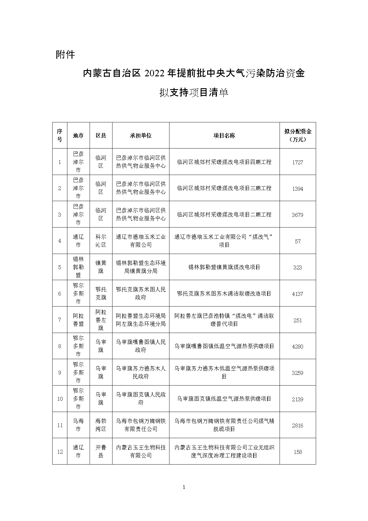 《內(nèi)蒙古自治區(qū)2022年提前批中央大氣污染防治資金擬支持項目清單》