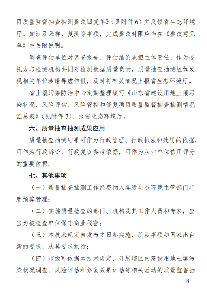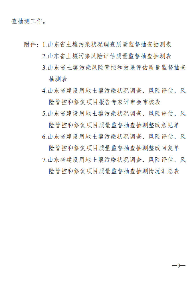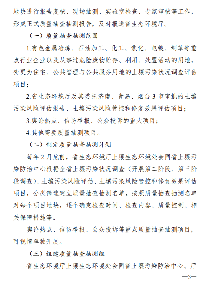 省生態(tài)環(huán)境廳將加強(qiáng)對(duì)各市、縣(市、區(qū))生態(tài)環(huán)境部門依法開展建設(shè)用地土壤污染狀況調(diào)查、風(fēng)險(xiǎn)管控和修復(fù)后期管理工作的監(jiān)督;將按照《山東省建設(shè)用地土壤污染狀況風(fēng)險(xiǎn)管控和修復(fù)項(xiàng)目質(zhì)量監(jiān)督抽查抽測(cè)技術(shù)規(guī)定》(見附件)要求,對(duì)符合條件要求的建設(shè)用地土壤污染風(fēng)險(xiǎn)管控和修復(fù)有關(guān)材料(包含調(diào)查報(bào)告、風(fēng)險(xiǎn)評(píng)估報(bào)告、風(fēng)險(xiǎn)管控和修復(fù)效果評(píng)估報(bào)告)開展報(bào)告質(zhì)量監(jiān)督抽查抽測(cè)。