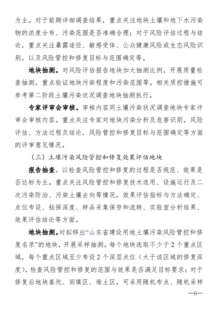 對(duì)符合評(píng)審要求的風(fēng)險(xiǎn)管控和修復(fù)效果報(bào)告,省生態(tài)環(huán)境廳在組織專家評(píng)審時(shí),應(yīng)督促評(píng)審專家嚴(yán)格按照《山東省建設(shè)用地土壤污染風(fēng)險(xiǎn)管控和修復(fù)技術(shù)文件質(zhì)量評(píng)價(jià)辦法(試行)》要求,對(duì)報(bào)告進(jìn)行嚴(yán)格把關(guān)。市級(jí)生態(tài)環(huán)境部門在省級(jí)召開風(fēng)險(xiǎn)管控和修復(fù)效果評(píng)估報(bào)告專家評(píng)審會(huì)前,要組織對(duì)地塊進(jìn)行現(xiàn)場(chǎng)檢查,出具檢查結(jié)果。縣級(jí)生態(tài)環(huán)境部門要做好采樣現(xiàn)場(chǎng)監(jiān)督檢查工作,并簽字確認(rèn)。