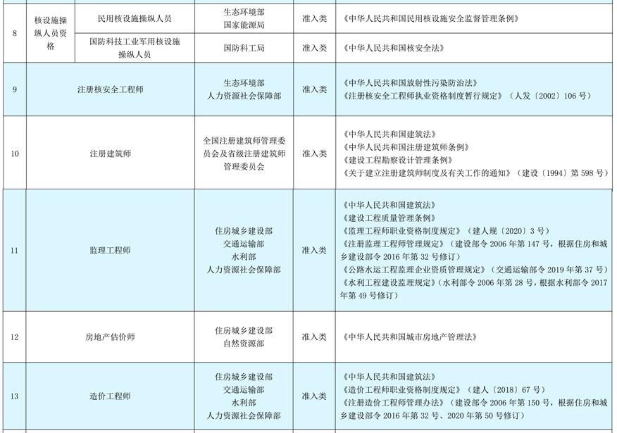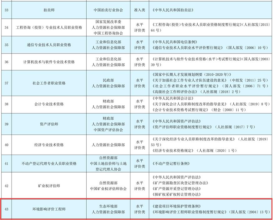 導(dǎo)讀:人力資源社會(huì)保障部近日公布了《國(guó)家職業(yè)資格目錄(2021年版)》。2021年版國(guó)家職業(yè)資格目錄共計(jì)72項(xiàng)職業(yè)資格。其中,專業(yè)技術(shù)人員職業(yè)資格59項(xiàng),含準(zhǔn)入類33項(xiàng),水平評(píng)價(jià)類26項(xiàng);技能人員職業(yè)資格13項(xiàng)。其中涉及注冊(cè)環(huán)保工程師和環(huán)境影響評(píng)價(jià)工程師(環(huán)評(píng)工程師)。 經(jīng)國(guó)務(wù)院同意,人力資源社會(huì)保障部近日公布了《國(guó)家職業(yè)資格目錄(2021年版)》。 2021年版國(guó)家職業(yè)資格目錄共計(jì)72項(xiàng)職業(yè)資格。其中,專業(yè)技術(shù)人員職業(yè)資格59項(xiàng),含準(zhǔn)入類33項(xiàng),水平評(píng)價(jià)類26項(xiàng);技能人員職業(yè)資格13項(xiàng)。目錄中準(zhǔn)入類職業(yè)資格關(guān)系公共利益或涉及國(guó)家安全、公共安全、人身健康、生命財(cái)產(chǎn)安全,均有法律法規(guī)或國(guó)務(wù)院決定作為依據(jù);水平評(píng)價(jià)類職業(yè)資格具有較強(qiáng)的專業(yè)性和社會(huì)通用性,技術(shù)技能要求較高,行業(yè)管理和人才隊(duì)伍建設(shè)確實(shí)需要。 本次調(diào)整是在2017年公布的《國(guó)家職業(yè)資格目錄》基礎(chǔ)上,根據(jù)黨中央、國(guó)務(wù)院轉(zhuǎn)變政府職能,推進(jìn)“放管服”改革要求,結(jié)合近年來(lái)國(guó)務(wù)院有關(guān)部門職責(zé)調(diào)整、行政審批事項(xiàng)改革等情況進(jìn)行的優(yōu)化。出入境檢疫處理人員資格、鄉(xiāng)村獸醫(yī)資格、注冊(cè)石油天然氣工程師等專業(yè)技術(shù)人員職業(yè)資格退出目錄。除與公共安全、人身健康等密切相關(guān)的職業(yè)工種外,73項(xiàng)水平評(píng)價(jià)類技能人員職業(yè)資格全部退出目錄,不再由政府或其授權(quán)的單位認(rèn)定發(fā)證。精算師、礦業(yè)權(quán)評(píng)估師、職業(yè)病診斷醫(yī)師等專業(yè)性和社會(huì)通用性強(qiáng)的專業(yè)技術(shù)人員職業(yè)資格納入目錄。危險(xiǎn)貨物、化學(xué)品運(yùn)輸從業(yè)人員,道路運(yùn)輸從業(yè)人員,特種作業(yè)人員,建筑施工特種作業(yè)人員,特種設(shè)備安全管理和作業(yè)人員等涉及人員資格的行政許可事項(xiàng)作為準(zhǔn)入類技能人員職業(yè)資格納入目錄。 優(yōu)化后的目錄與2017年相比,職業(yè)資格減少了68項(xiàng),削減49%,對(duì)于進(jìn)一步提高職業(yè)資格設(shè)置管理科學(xué)化、規(guī)范化水平,推動(dòng)降低就業(yè)創(chuàng)業(yè)門檻,優(yōu)化就業(yè)創(chuàng)業(yè)環(huán)境,持續(xù)激發(fā)市場(chǎng)主體活力和社會(huì)創(chuàng)造力,推動(dòng)高質(zhì)量發(fā)展具有重要意義。
