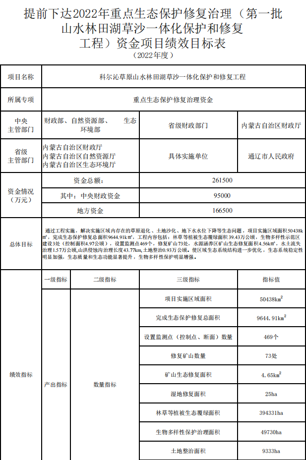 根據(jù)《財政部關于提前下達2022年重點生態(tài)修復治理資金預算的通知》(財資環(huán)〔2021〕113號),現(xiàn)下達2022年中央重點生態(tài)修復治理(Z135060009003)資金預算95000萬元,專項用于科爾沁草原山水林田湖草沙一體化保護和修復工程建設。支出列2021年政府預算收支科目“2200199—其他自然資源事物支出”。并將有關事項通知如下:
