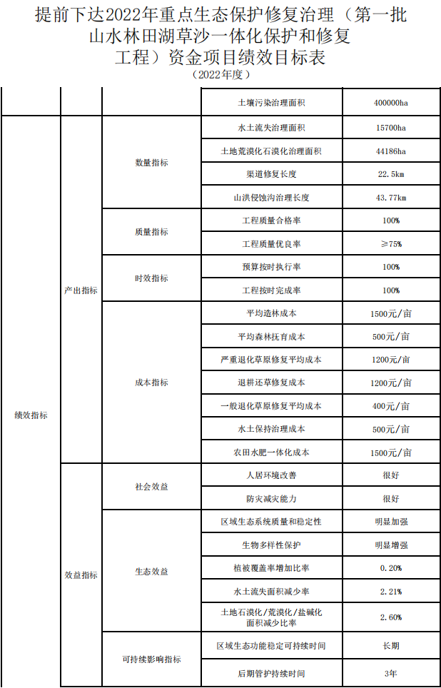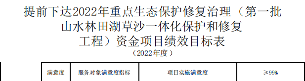 提前下達中央2022年重點生態(tài)保護修復治理(第一批山水林田湖草沙一體化保護和修復工程)資金項目績效目標表(2022年度)