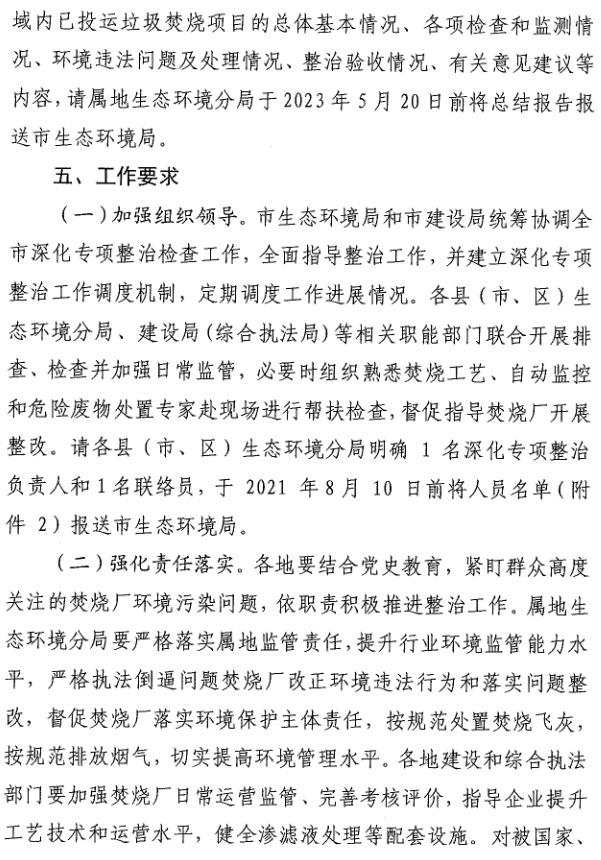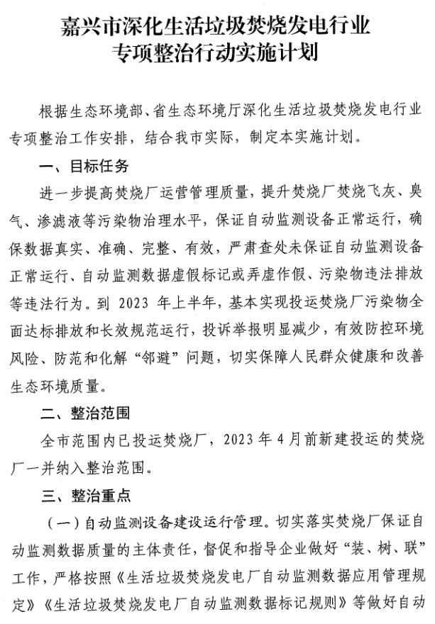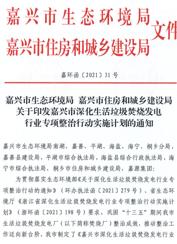 《嘉興市深化生活垃圾焚燒發(fā)電行業(yè)專項(xiàng)整治行動(dòng)實(shí)施計(jì)劃》(嘉環(huán)函【2021】31號(hào))