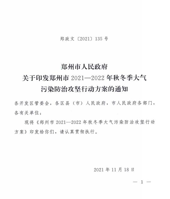 《鄭州市2021-2022年秋冬季大氣污染防治攻堅(jiān)行動(dòng)方案》(鄭政文【2021】135)