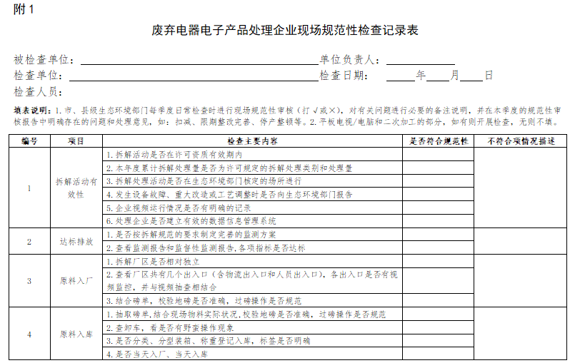 附1:廢棄電器電子產(chǎn)品處理企業(yè)現(xiàn)場(chǎng)規(guī)范性檢查記錄表