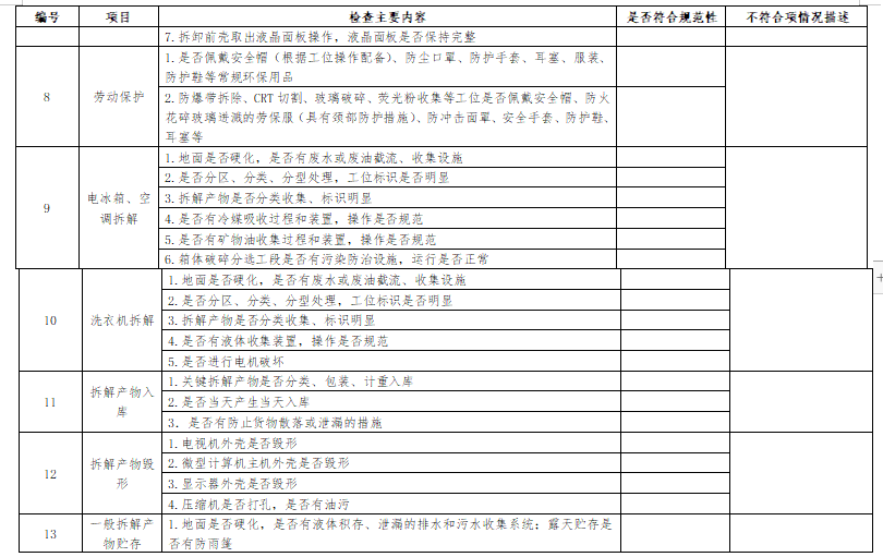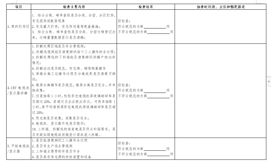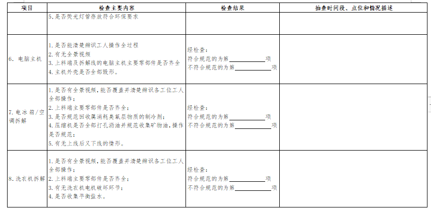 經(jīng)抽取拆解過(guò)程的視頻監(jiān)控情況;電視機(jī)拆解錐玻璃切割、熒光粉吸取等重點(diǎn)工位的操作;電腦主機(jī)拆解操作、光驅(qū)、硬盤、電源等關(guān)鍵部件分類收集情況,機(jī)箱壓縮毀形情況;洗衣機(jī)拆解工位的操作、廢礦物油收集情況,操作是否規(guī)范,是否存在暴力拆解行為。