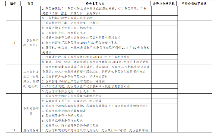 拆解產(chǎn)生的廢印刷電路板、CRT彩電錐玻璃、熒光粉、制冷劑、壓縮機(jī)油、含汞背光燈管、主板、網(wǎng)卡、聲卡、顯卡、CPU、內(nèi)存條等危險(xiǎn)廢物的處理去向。通過(guò)對(duì)轉(zhuǎn)移聯(lián)單及各級(jí)生態(tài)環(huán)境部門批復(fù)的轉(zhuǎn)移文件等資料的審核,該企業(yè)的轉(zhuǎn)移活動(dòng)是否符合規(guī)定要求。