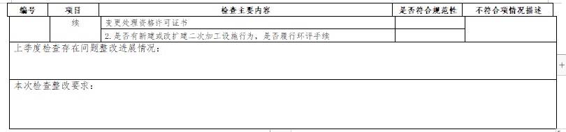 企業(yè)是否存在新建、改建、擴(kuò)建處理設(shè)施的情況,是否辦理環(huán)保手續(xù),并重新申請(qǐng)?zhí)幚碣Y格證書(shū)。企業(yè)是否存在新建、改建、擴(kuò)建二次加工設(shè)施的情況,是否辦理環(huán)保手續(xù)。