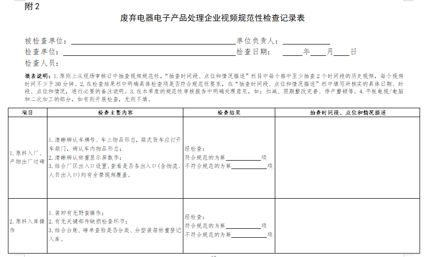 附2:廢棄電器電子產(chǎn)品處理企業(yè)視頻規(guī)范性檢查記錄表
