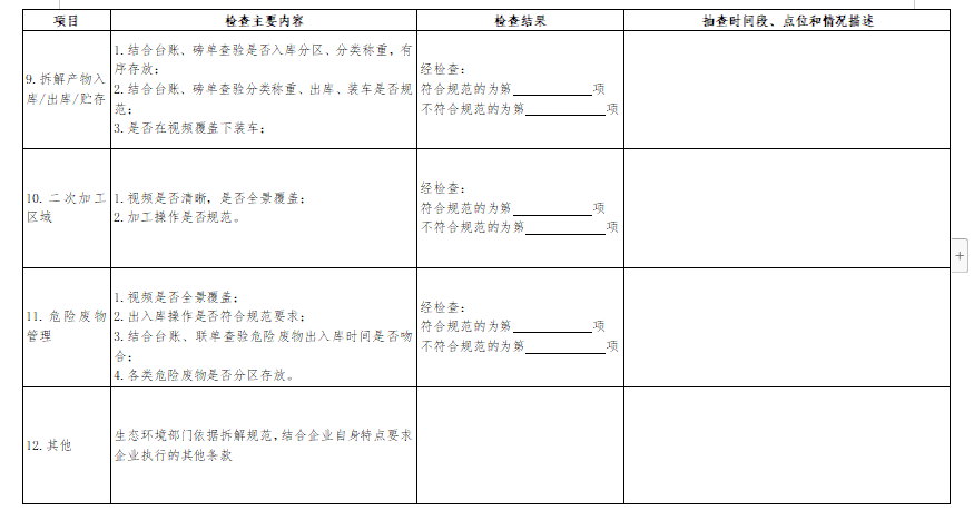 **公司對(duì)本季度拆解處理情況進(jìn)行了自查扣減,扣減數(shù)量為**,扣減情形為***,結(jié)合日常監(jiān)管、視頻抽查,認(rèn)為該企業(yè)自查扣減情形是(否)合理。如果存在自查扣減不到位的情況,要求企業(yè)進(jìn)一步扣減,或生態(tài)環(huán)境部門結(jié)合管理情況提出扣減建議,明確扣減原因,扣減規(guī)則。