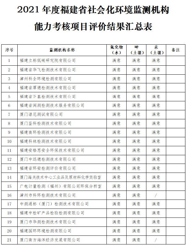 福建省生態(tài)環(huán)境廳關(guān)于公布2021年度社會(huì)化環(huán)境監(jiān)測(cè)機(jī)構(gòu)能力考核結(jié)果的通知