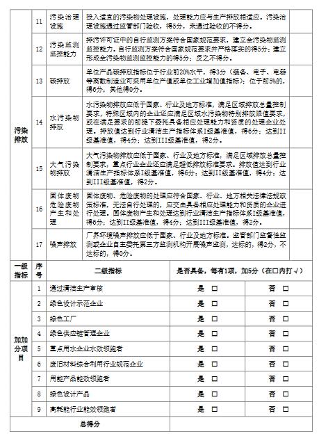 申報企業(yè)及其產(chǎn)品三年內(nèi)獲得省級以上工業(yè)產(chǎn)品綠色設(shè)計示范企業(yè)、綠色工廠、綠色供應(yīng)鏈管理企業(yè)、重點用水企業(yè)水效領(lǐng)跑者、廢舊材料綜合利用行業(yè)規(guī)范企業(yè)、用能產(chǎn)品能效領(lǐng)跑者、綠色設(shè)計產(chǎn)品、高耗能行業(yè)能效領(lǐng)跑者等榮譽的,以及企業(yè)通過清潔生產(chǎn)審核的,每有1項,加5分,可累計加分,同類榮譽計算1次。