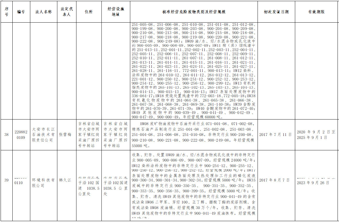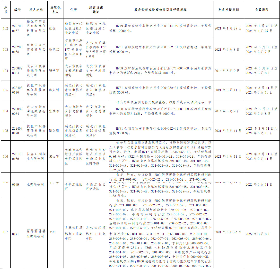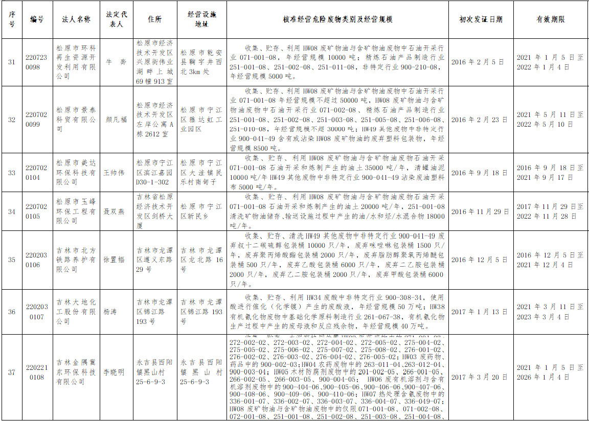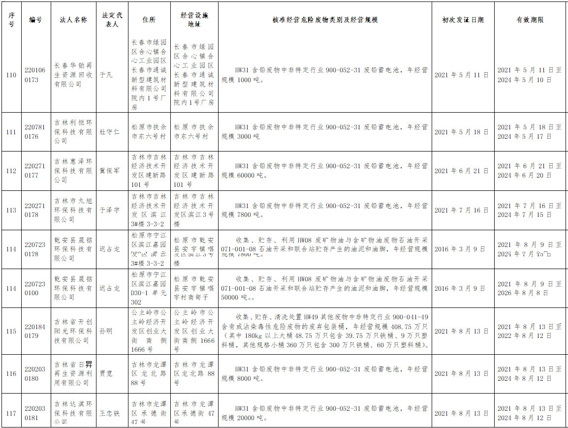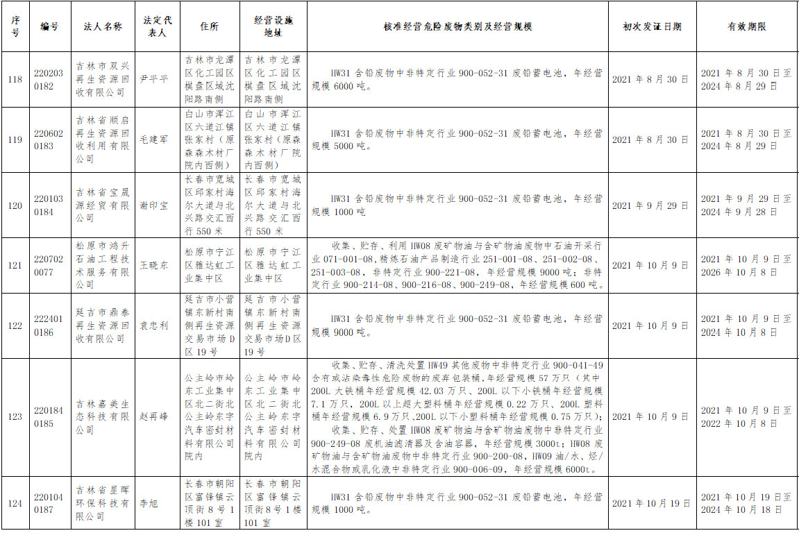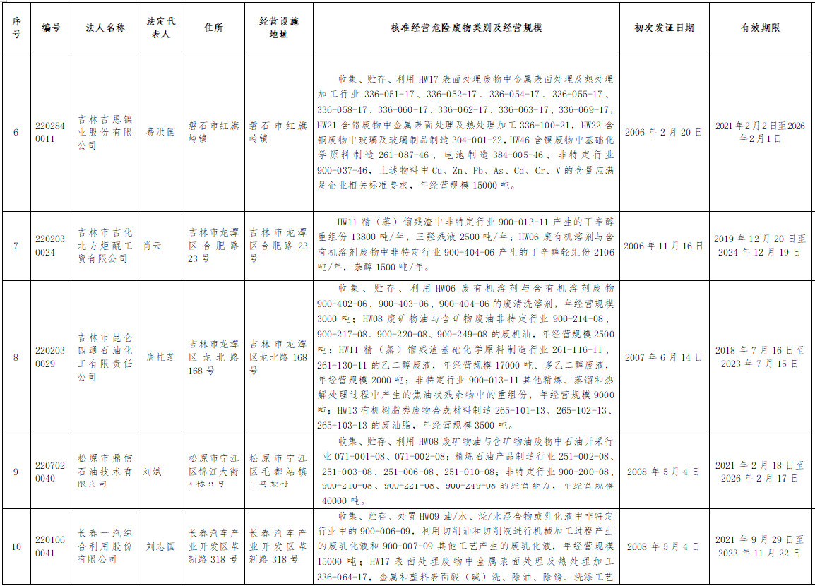 《吉林省危險廢物經(jīng)營許可證持證企業(yè)名單》(2021年10月更新)