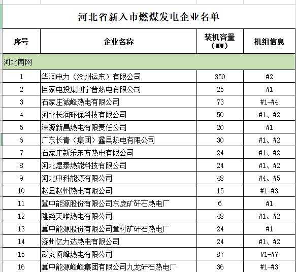 《河北省新入市燃煤發(fā)電企業(yè)名單》